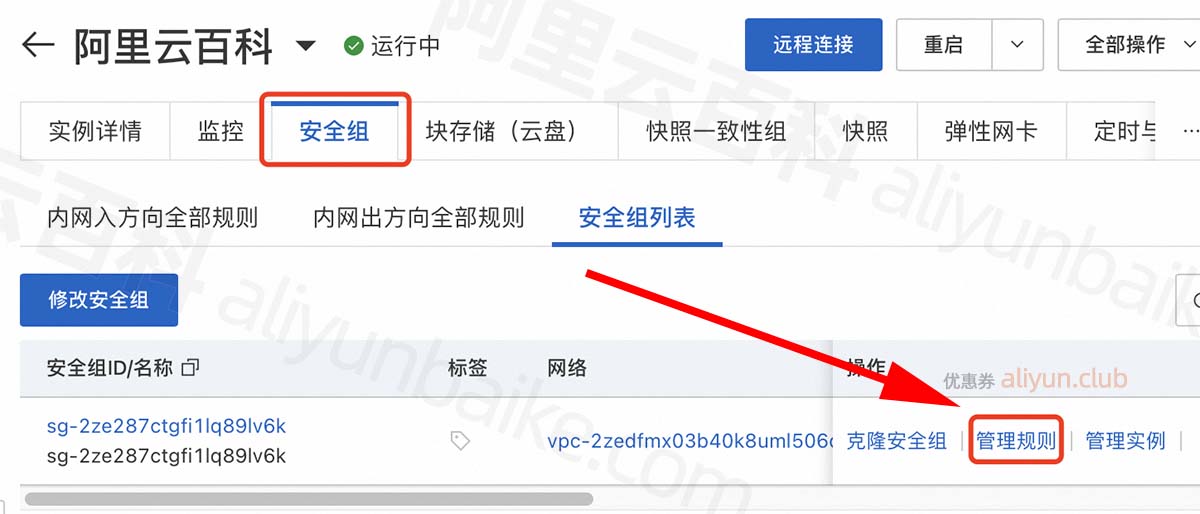 2、在实例页面,选择“安全组”,点击“管理规则”,如下图:
