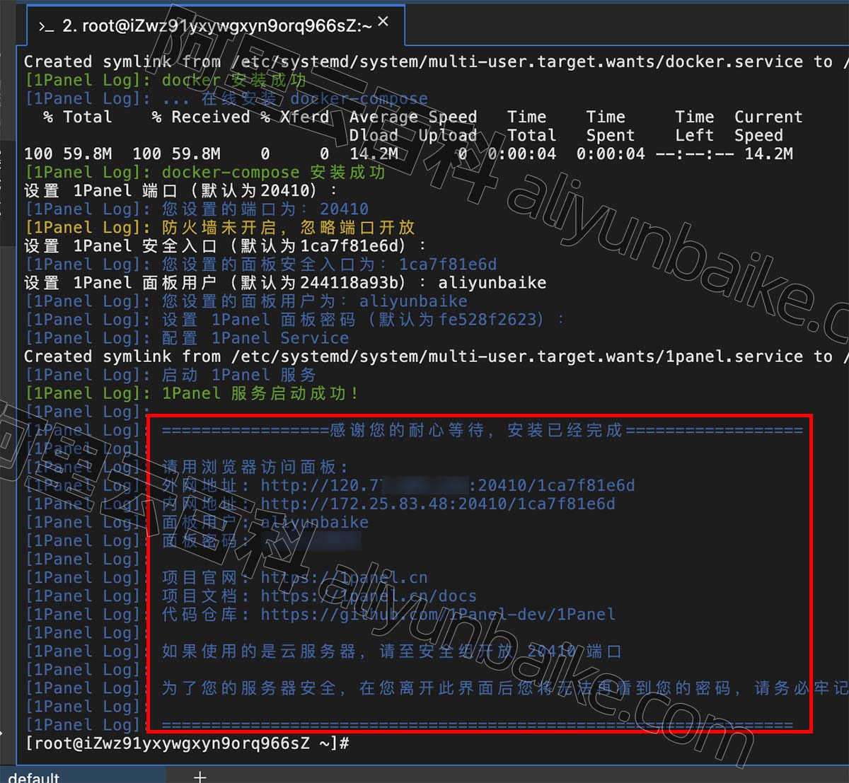 注意:处于安全考虑,阿里云并没有开通1Panel默认端口号,所以安装完成后,需要去安全组开通20410这个端口号。文章后面有教程。