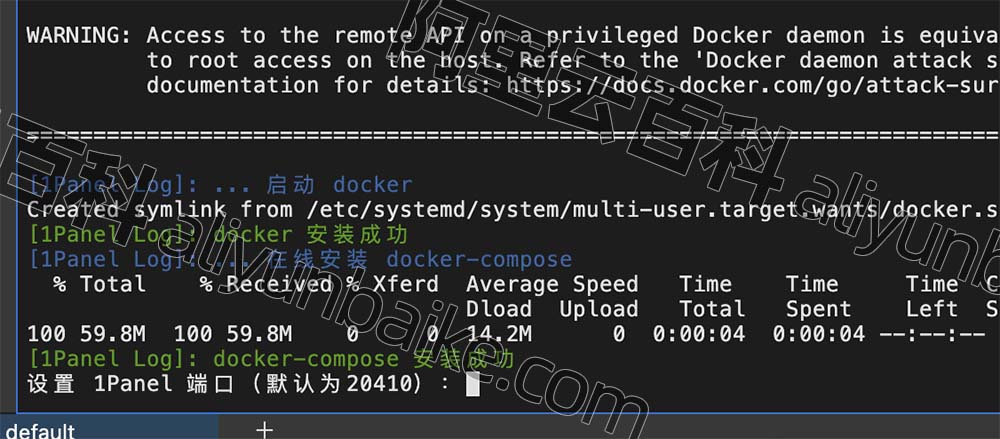 1Panel安装成功后,需要设置默认端口号,回车代表选择默认端口号,也可以自定义端口,阿里云服务器网选择了默认20410端口,回车即可。