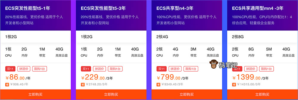 阿里云去年双十一主打活动就是服务器拼团,今年拼团继续,去年是服务器99元起,今年是86元起,价格真的可以了,码笔记带大家看看今年阿里云双十一服务器拼团优惠价格表: