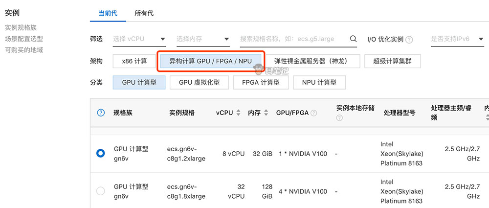 打开「GPU云服务器 - 阿里云」,选择“异构计算 GPU / FPGA / NPU”,如下图所示: