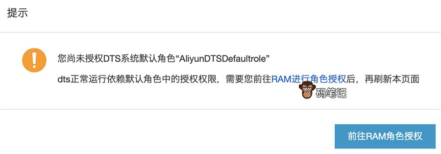 阿里云尚未授权DTS系统默认角色“AliyunDTSDefaultrole”,数据传输dts正常运行依赖默认角色中的授权权限,所以需要在阿里云访问控制RAM中授权数据传输DTS默认角色,让DTS获取到权限,码笔记来详细说下阿里云访问控制RAM和数据传输DTS: