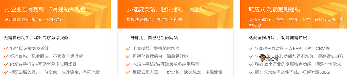 阿里云心选建站可以分为三类,即云·企业官网定制、云·速成美站和响应式功能定制建站,码笔记来总结一下: