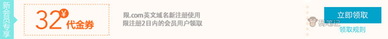 阿里云域名代金券免费领取,com后缀域名32元代金券,码笔记分享阿里云com域名代金券领取地址、条件及使用说明: