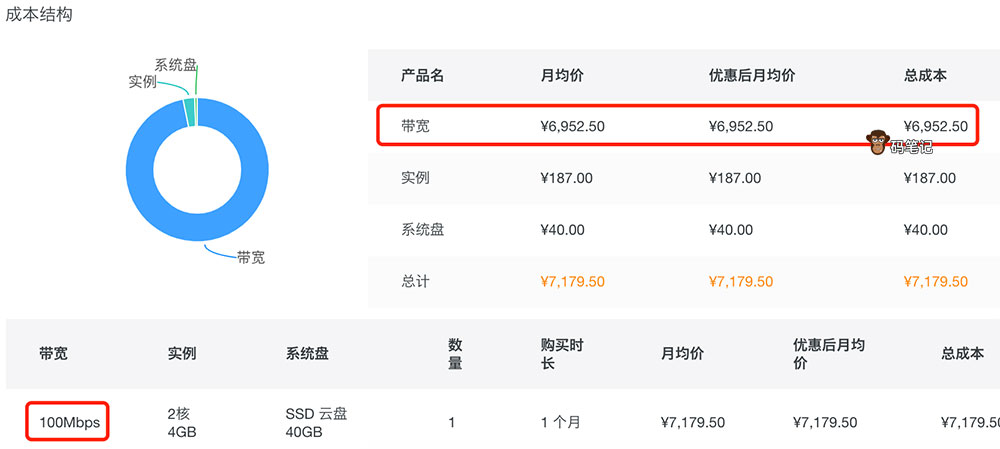 如上表所示,当阿里云带宽达到6M及6M以上,带宽单价上涨到80元/M/月,码笔记发现并不是全部上涨到80元/M/月,只是超过5M的部分按照80元计算。可是阿里云带宽还是贵,像国外一些VPS厂商,带宽动不动上百M,要是在阿里云选择100M带宽,一个月带宽价格需要7000元,如下图所示: