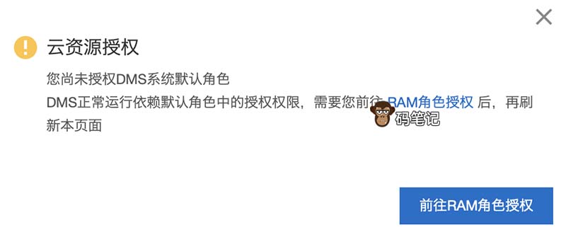 DMS正常运行依赖默认角色中的授权权限,需要您前往RAM角色授权后,再刷新本页面