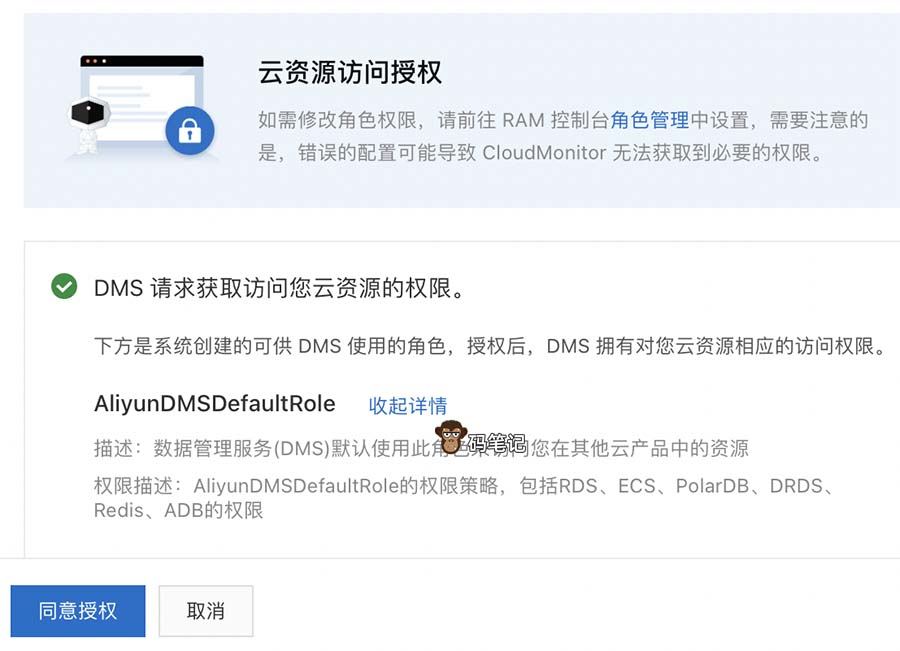 是什么意思?DMS可用于管理阿里云数据库,DMS想要管理用户在云上的数据库实例,需要先在RAM中获得角色授权。不用过于担心,同意DMS请求获取访问您云资源的权限即可。