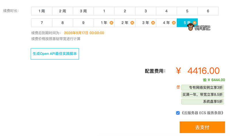 阿里云ECS云服务器续费价格是用户比较关心的,码笔记分享ECS云服务器续费优惠折扣表: