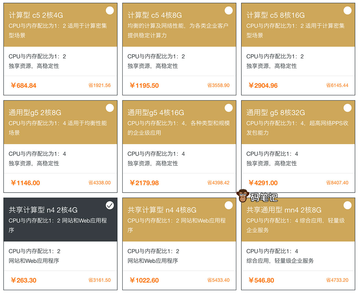 | 计算型 c5 | 4核/8G/1M/40G高效云盘 | 1M宽带 | 1195.50元/年 | |