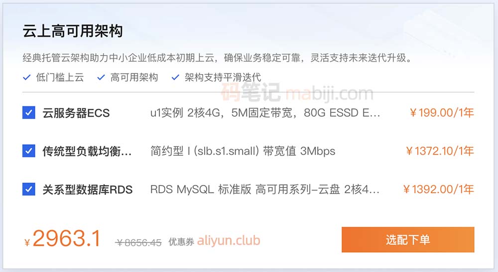 中小企业云上高可用架构,基于阿里云选择云服务器ECS、传统型负载均衡CLB和关系型数据库RDS,总费用2963.1元一年,可领券 aliyun.club 领取优惠券和云服务器报价单。码笔记整理如下图: