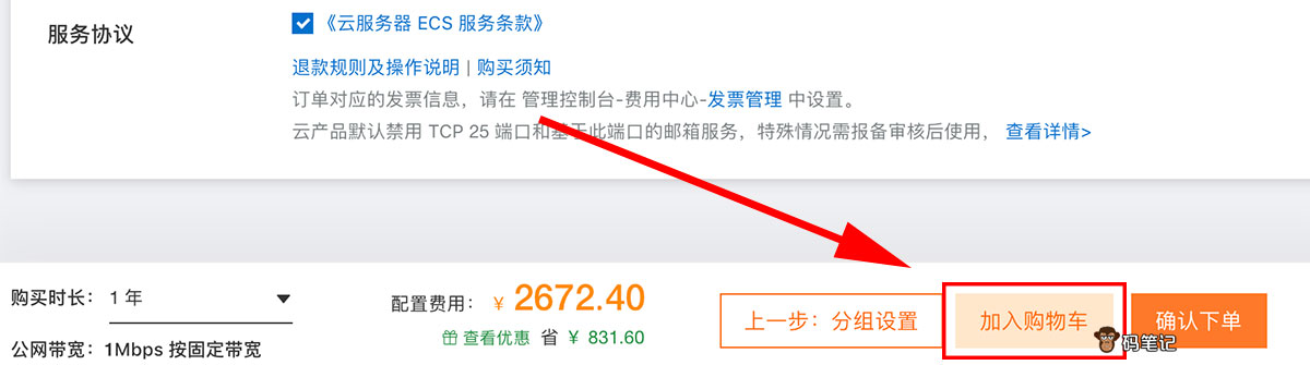 如何阿里云购物车功能?很简单,码笔记以购买云服务器为例,选择好ECS云服务器配置后,不要选择确认下单,要选择“加入购物车”,如下图所示: 阿里云购物车