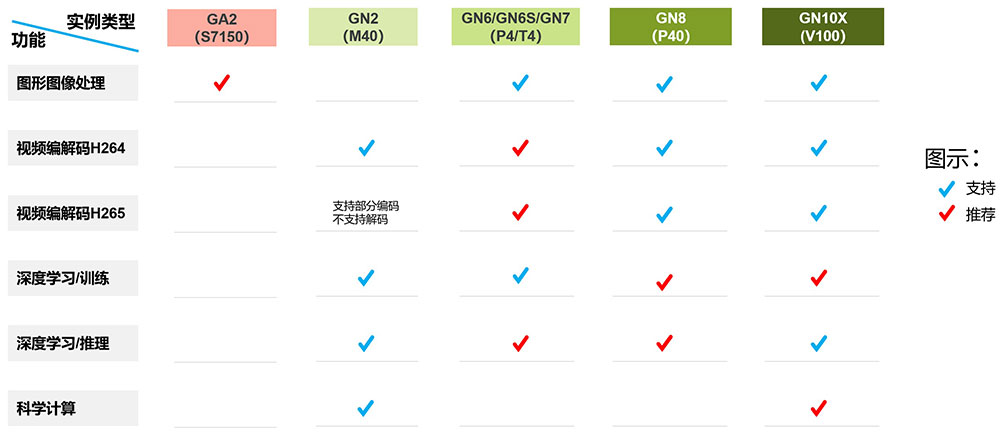 | 深度学习训练 | 推荐使用 GN8/GN10X 实例。 GN8/GN10X 实例采用 P40、V100 中高端 GPU,具有强大的单精度浮点运算能力,并具备较大的 GPU 板载内存,是深度学习训练的首选。 | |