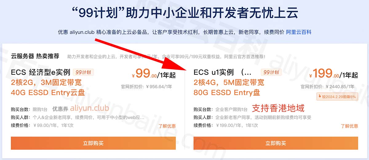 阿里云服务器ECS通用算力型u1实例:2核4G、5M固定带宽、80G ESSD Entry盘,香港地域,优惠价格199元一年,续费也是199元1年,购买条件为企业用户,新用户还是老用户都可以,但必须是企业用户,如下图: