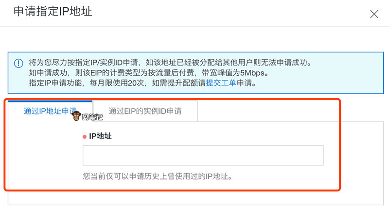 阿里云ECS云服务器公网IP被释放后如何找回原IP地址?码笔记发现一个阿里云找回公网IP的功能:申请指定IP地址,大家可以试一下看看能不能找回: