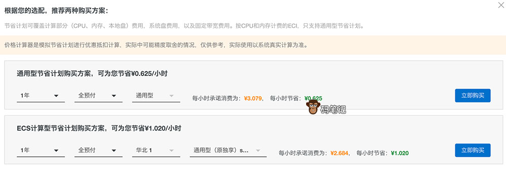 将ECS实例加入清单后,点击右侧节省计划计算器,即可计算出两种方案,即通用型节省计划购买方案和ECS计算型节省计划购买方案,如下图: