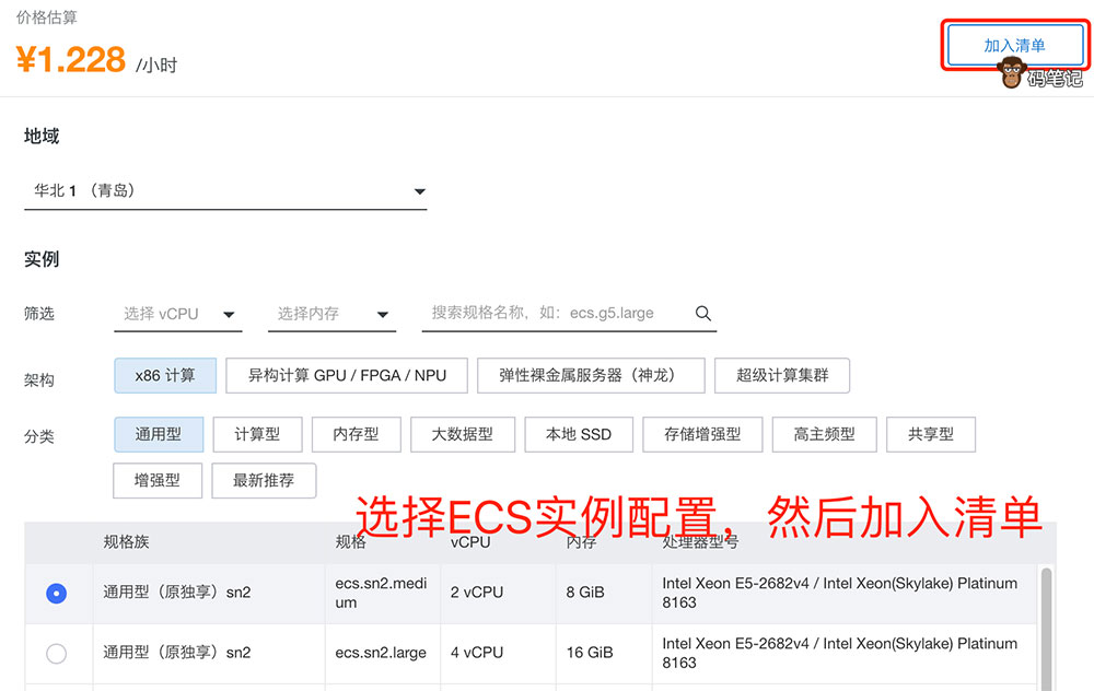 在左侧栏选择ECS实例规格配置,然后点击右侧加入清单,如下图: