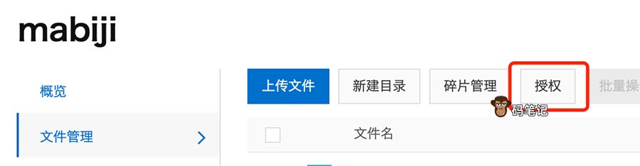 如下图所示,在Bucket文件管理中,使用授权功能来授权对应的用户操作此Bucket中的文件