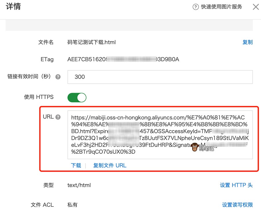 使用OSS对象存储搭建的网盘如何下载呢?码笔记建议网盘类的OSS读写权限选择私有。下载私有文件也很简单,点击需要下载的文件,URL中会生成带有OSSAccessKeyId的URL链接,点击即可下载,如下图: