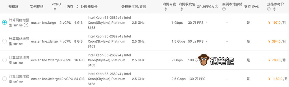 阿里云计算网络增强型sn1ne云服务器是企业级高性能云服务器规格,sn1ne是100%独占资源的云服务器,码笔记分享计算网络增强型sn1ne实例的配置、性能评测及优惠信息: