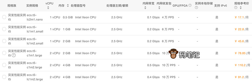 阿里云突发性能型t5云服务器是入门级云服务器规格,突发性能t5是限制CPU性能的云服务器,码笔记分享突发性能t5实例的配置、性能评测及优惠信息: