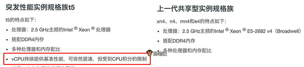 作为入门级云服务器,xn4实例和t5实例算是ECS云服务器的明星产品,二者经常被拿来对比,价格差不多,到底是选择xn4实例还是突发性能t5实例呢?码笔记认为xn4实例和t5实例的主要区别在于CPU,虽然二者都是搭载2.5GHz主频的Intel Xeon处理器,但是突发性能t5是限制CPU性能基线的: