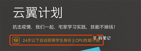阿里云服务器学生专享活动申请门槛降低,24岁以下自动获得学生身份无需学生认证,阿里云学生服务器优惠计划即云翼计划,符合申请条件9.5元即可申请一台阿里云学生机,码笔记分享阿里云学生服务器申请地址及购买攻略: