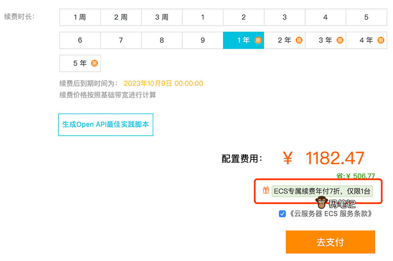 码笔记记得阿里云ECS云服务器续费1年的折扣是85折、续费3年能拿到5折,刚刚看到现在续费一年的折扣是7折,续费3年以上都是5折,如下图所示:
