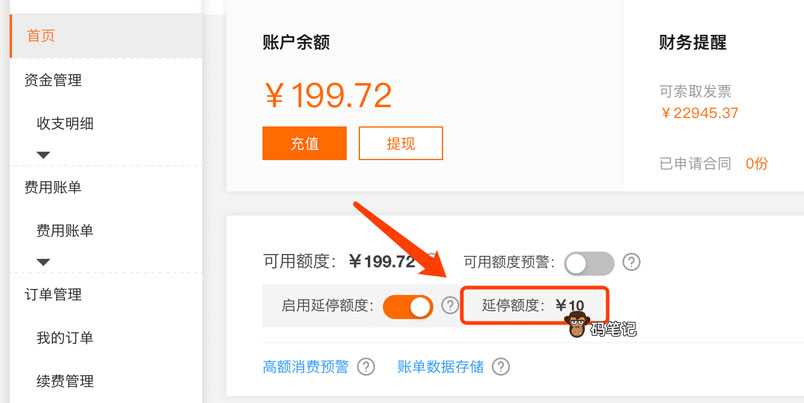在阿里云用户中心控制台即可查询当前阿里云账号的“延停额度”,如下图所示: