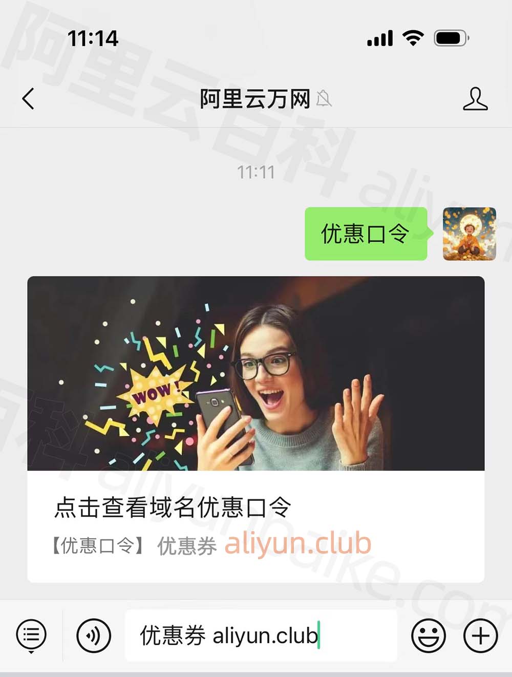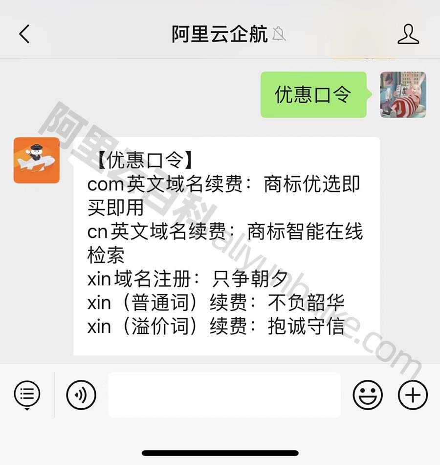 阿里云优惠口令在哪查询?关注公众号“阿里云万网”,在输入框中输入“优惠口令”,公众号即可自动回复当前有效可用的优惠口令,如下图: