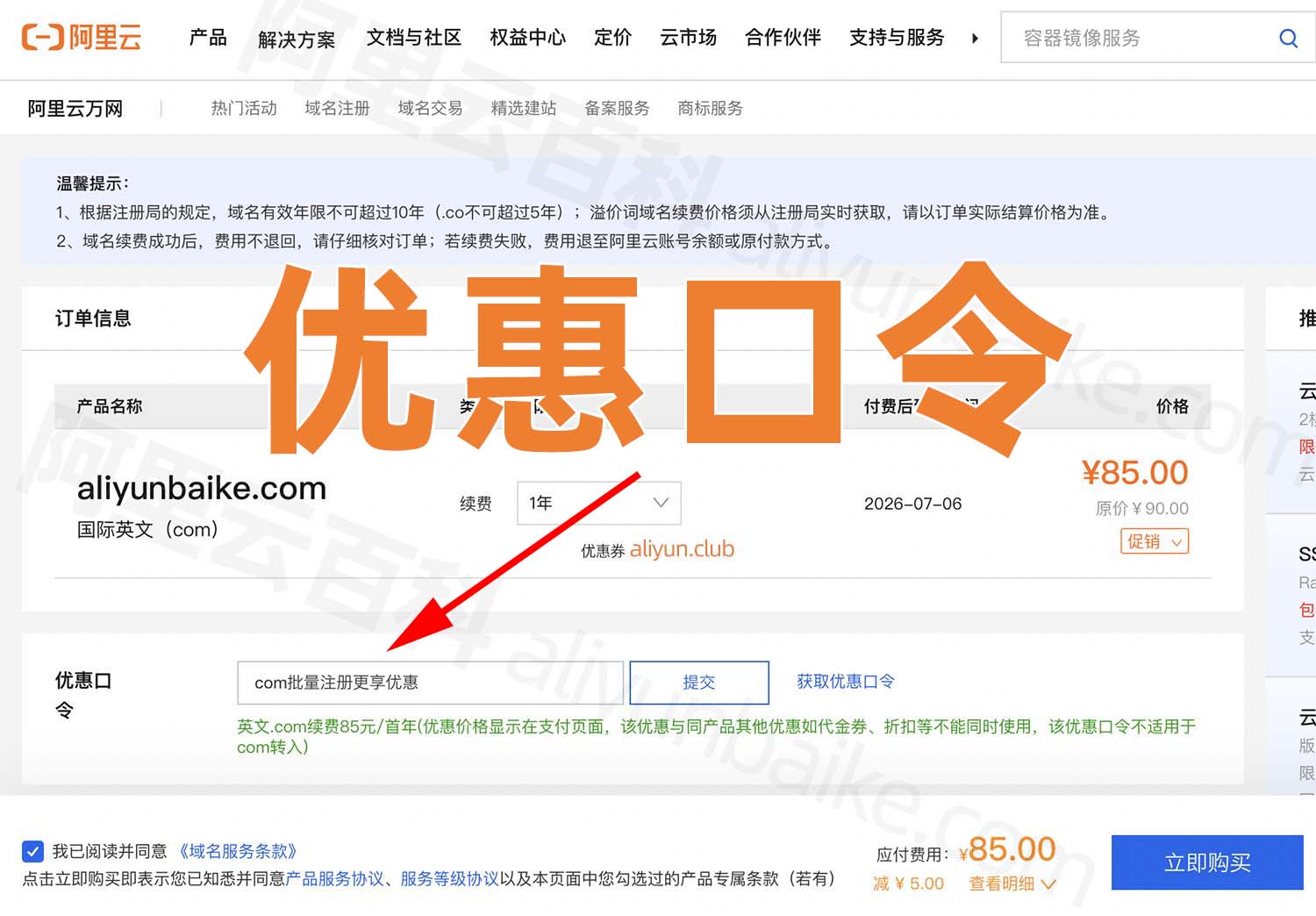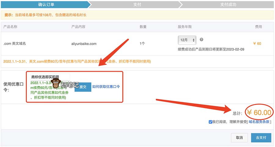 码笔记以阿里云com域名续费为例,正常续费域名,在确认订单页面的使用优惠口令输入框中输入优惠口令,然后点提交,如下图: