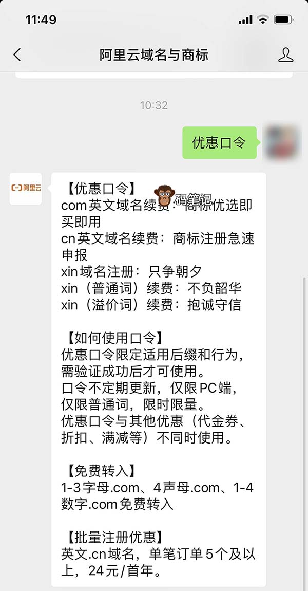 如何获取阿里云域名优惠口令?关注“阿里云域名与商标”,在输入框中输入“优惠口令”,即可自动回复当前最新可用的优惠口令,如下图: 阿里云域名优惠口令获取方法