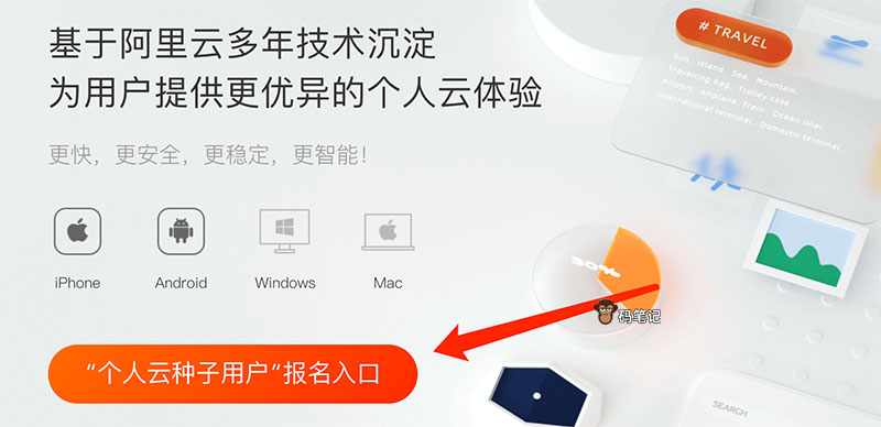 阿里云盘上线需要使用邀请码,在阿里云盘官网个人种子用户可以申请邀请码,阿里云盘阿里云强大的云计算存储及带宽资源,相信无论从存储容量还是下载速度上都是很不错的,码笔记也是第一时间申请了阿里云盘邀请码,码笔记分享阿里云盘官网地址及邀请码申请方法: