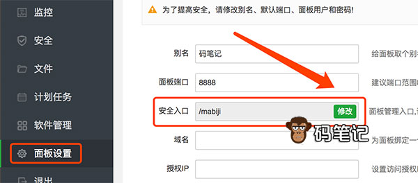新版宝塔面板新增了安全入口登录方式,默认安装完宝塔会随即生成8位字符安全入口,用户可以自定义这个安全入口,码笔记分享安全入口的设置方法: