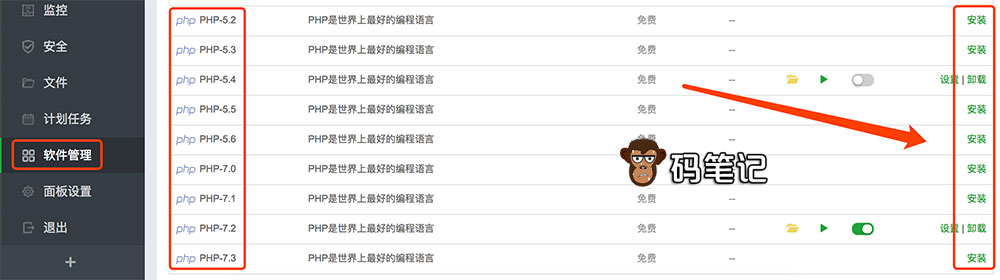 宝塔面板默认安装的PHP版本是5.4,因为程序的原因需要升级为PHP7.2版本,码笔记分享宝塔更换PHP版本的方法: