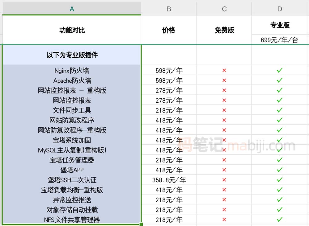 宝塔linux面板或宝塔windows面板专业版价格是699元/年/台,相比免费版,专业版可以免费使用以下插件,如果是免费版的宝塔面板,使用以下插件是需要付费的。