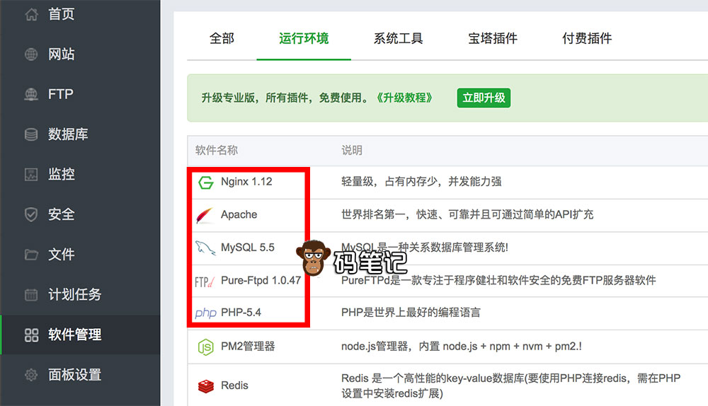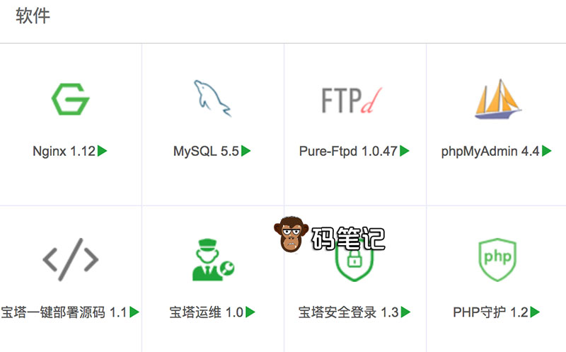 在宝塔面板后台首页即可看到当前软件环境的版本号,首页可以看到:Nginx、MySQL、Pure-Ftpd和phpMyAdmin软件版本,但是默认PHP的版本在首页是看不见的,码笔记分享查看软件版本方法: