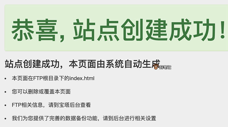输入网站域名提示“恭喜, 站点创建成功!”,怎么显示我的网站内容呢?如下所示: