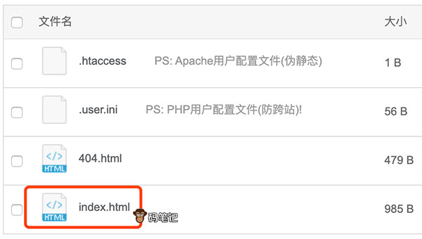 到这一步说明域名解析没有问题,添加站点没有问题,问题出在哪?这个页面是宝塔面板添加站点后,宝塔自动生成的页面,默认首页为index.html,如下图所示: