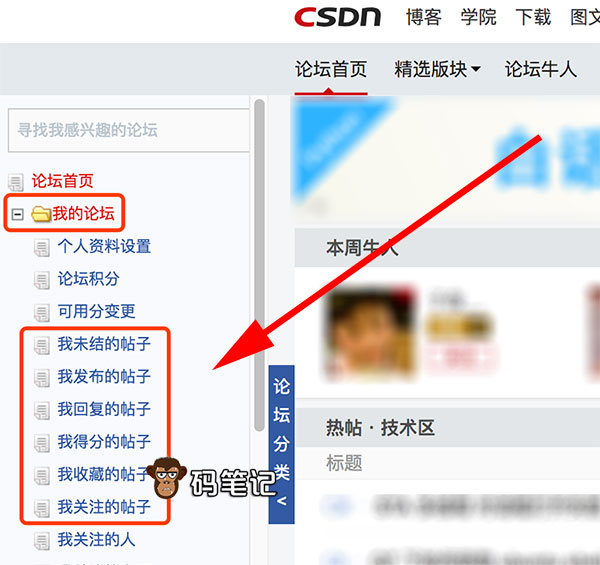 在CSDN论坛发布了帖子,回头再找发现很不容易找,不可否认我脑子是笨一点,但是还是觉得论坛优化的不太好,那么如何找到我发布的帖子呢?很简单,在左上角,码笔记找了5分钟,分享给大家:
