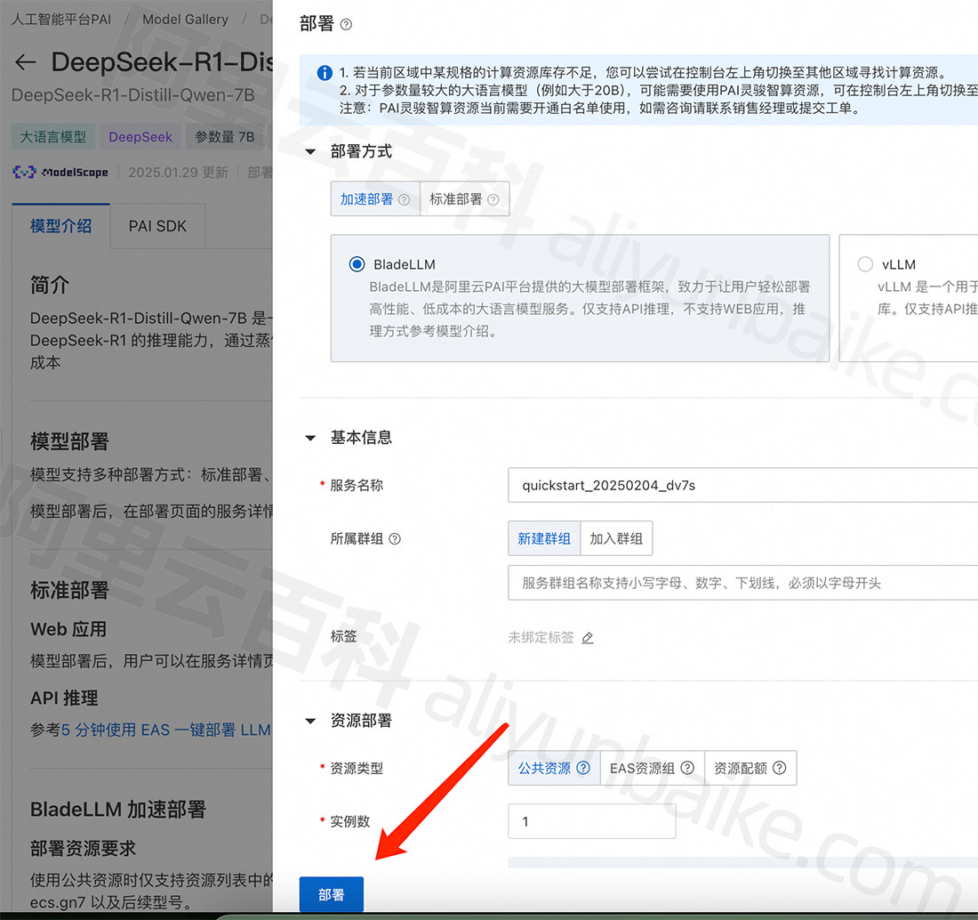 目前DeepSeek-R1支持采用vLLM加速部署;DeepSeek-V3 支持vLLM加速部署以及Web应用部署;DeepSeek-R1蒸馏小模型支持采用BladeLLM(阿里云PAI自研高性能推理框架)和vLLM加速部署。选择部署方式和部署资源后,即可一键部署服务,生成一个PAI-EAS服务。点击右上角的“部署”,如下图: