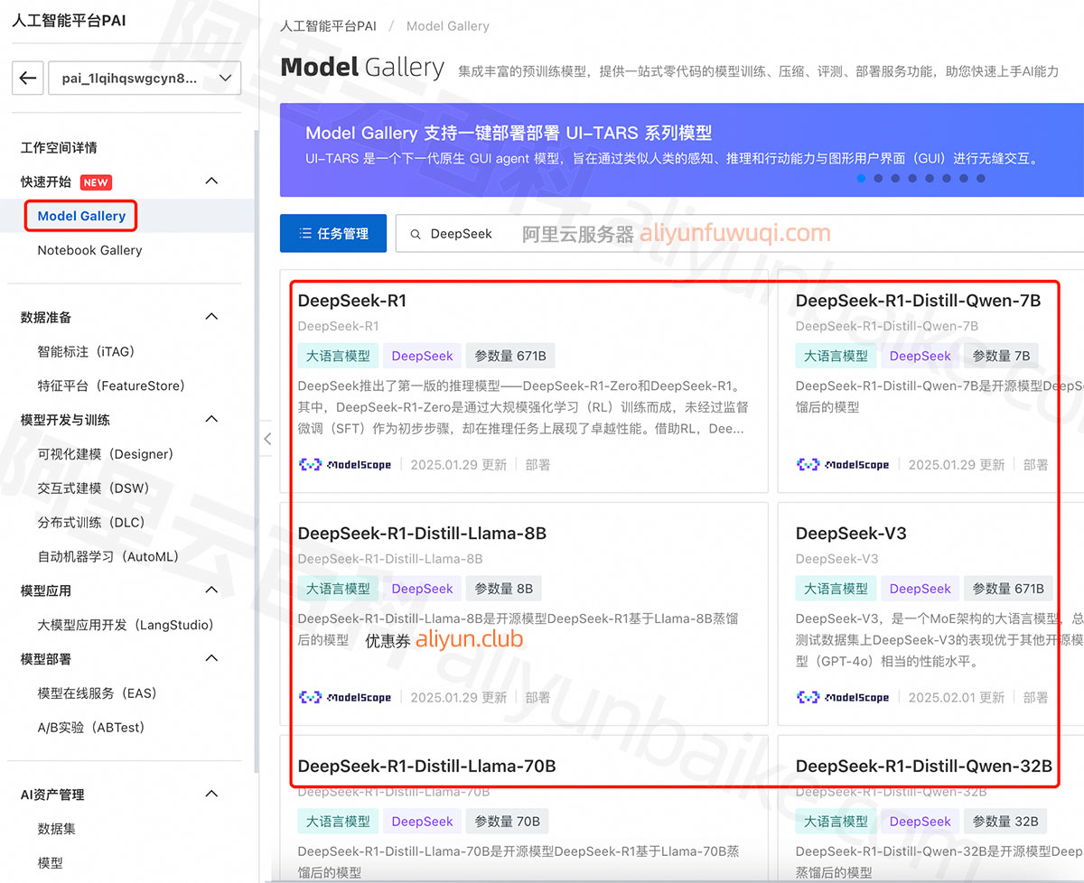 开通完成之后,进入PAI的管理控制台:mabiji.com/console/pai 点击左侧的“Model Gallery”,搜索“DeepSeek”,即可看到当前PAI支持的DeepSeek大模型版本,如下图: