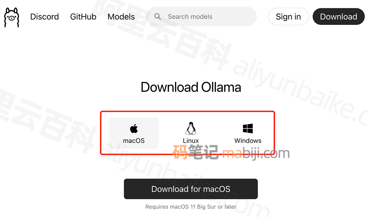 根据你本地电脑的操作系统类型下载对应的Ollama版本,目前Ollama支持macOS、Linux和Windows主流操作系统。关于Ollama的下载和安装,码笔记就不多赘述。