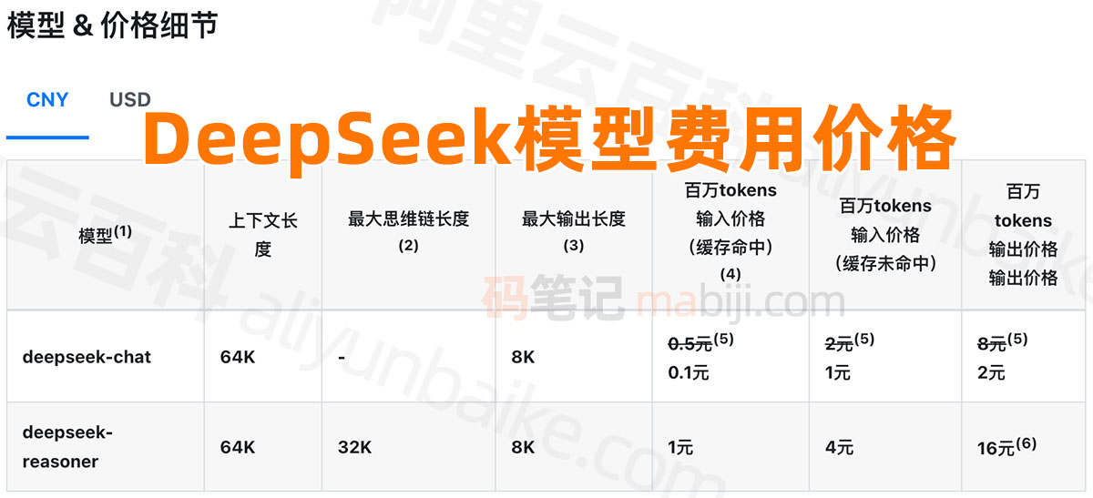 DeepSeek模型价格2025年最新DeepSeek R1和DeepSeek V3最新收费标准,低至0.1元百万tokens,码笔记mabiji.com分享DeepSeek官网发布的DeepSeek模型价格,以百万 tokens为单位: