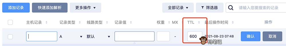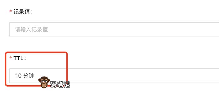 码笔记域名为www.mabiji.com,这个域名解析到服务器IP地址假设是7.7.7.7,添加域名解析的时候将TTL设置为10分钟。