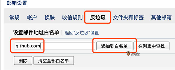 码笔记以QQ邮箱为例,将GitHub加入到邮箱白名单即可。登录到你的邮箱,点击【设置】-【反垃圾】-【白名单】,将github.com添加到邮箱白名单即可,如下图所示: