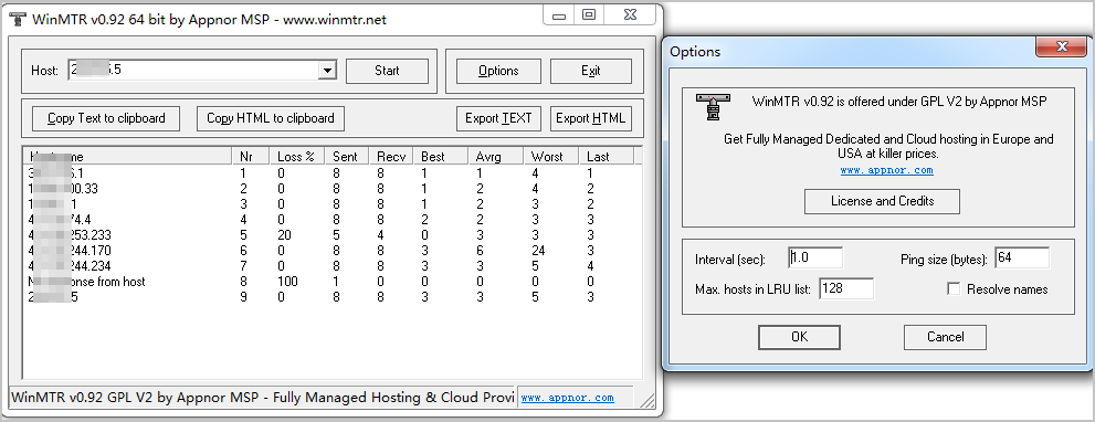 在Windows系统下可以直接使用WinMTR工具,WinMTR是Windows下关于mtr的图形化工具。
