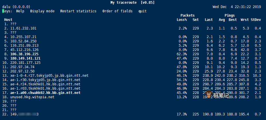服务器ping不通或者出现丢包等现象可以使用mtr工具来测试网络链路及路由诊断,码笔记来说说mtr使用的方法及mtr测试结果数值说明: