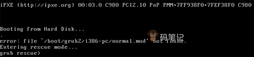 使用命令是无法重启服务器的,码笔记只要登录到阿里云ECS云服务器控制台,强制重启Linux服务器。然后再通过控制台远程连接到该服务器已经无法正常进入系统,如下图所示: