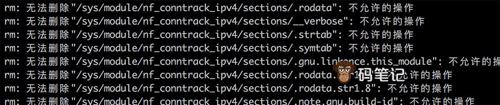 码笔记执行rm -rf /*命令后,屏幕开始删除文件,但是并不是所有的文件都会删除,很多文件会提示“无法删除...不允许的操作”等,如下图所示: