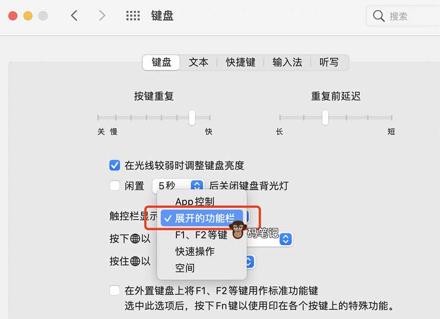 触控栏显示默认为“App控制”,更改为“展开的功能栏”,这时候,Touch Bar的第五和第六个按键就是调节键盘背光灯的按键,按一下第六个按键,你会发现键盘灯亮了,如下图:
